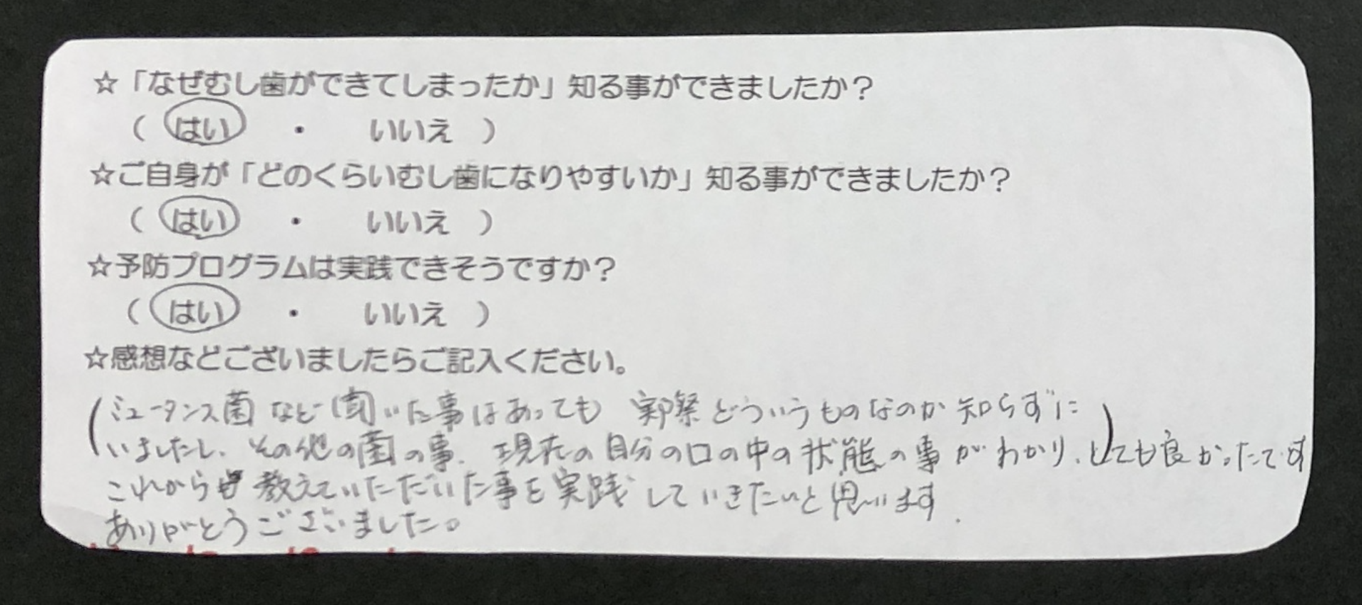 一人ひとり異なるむし歯の原因と効果的な予防プログラムを、わかりやすいビジュアルで示してますので、「何がむし歯の原因だったのか」「何をすればいいのか」を一緒に考えることができます。
